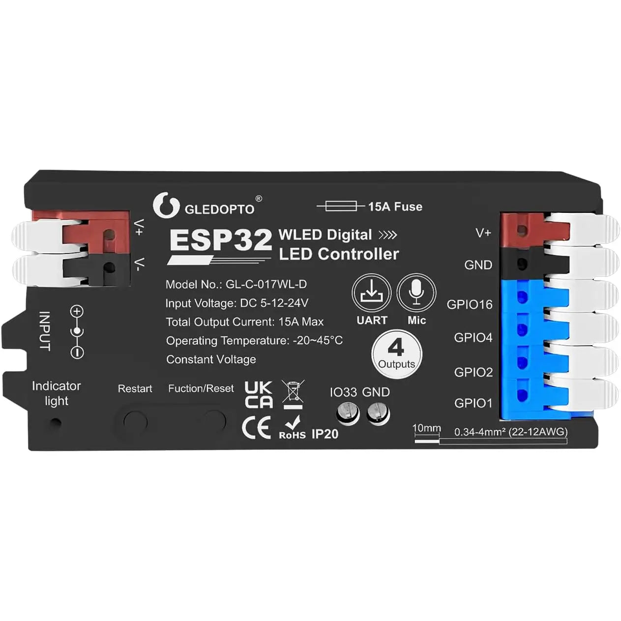 The Gledopto GL-C-017WL-D WLED Sound Reactive Addressable LED Strip Controller can control 4 independent LED strips. Includes a microphone for sound/music synchronised effects, quick release terminals for easy wiring. Supports most addressable LED strips 5V, 12V or 24V, for a total of 15A across all channels, or power led strips independently for more power.
