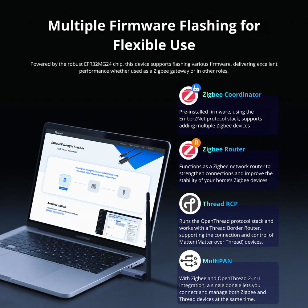 Built on the advanced Silicon Labs EFR32MG24 chipset, this dongle provides higher performance, richer system resources, and faster automation processing, resulting in stable and responsive control of Zigbee sub-devices. It supports Zigbee 3.0 and can be flashed with alternative firmware to enable additional roles, including experimental Thread support, offering flexibility for future smart home standards.